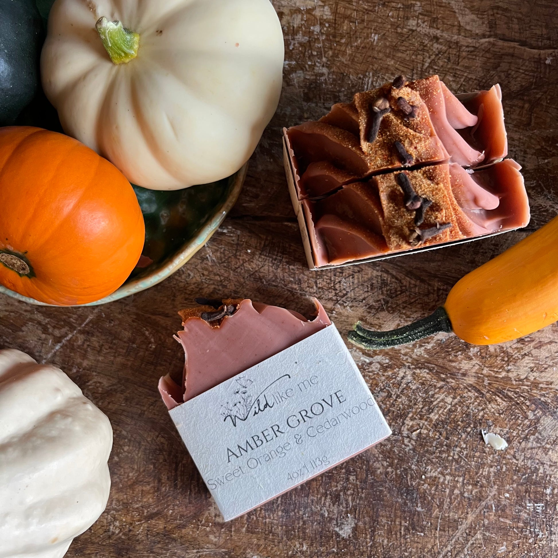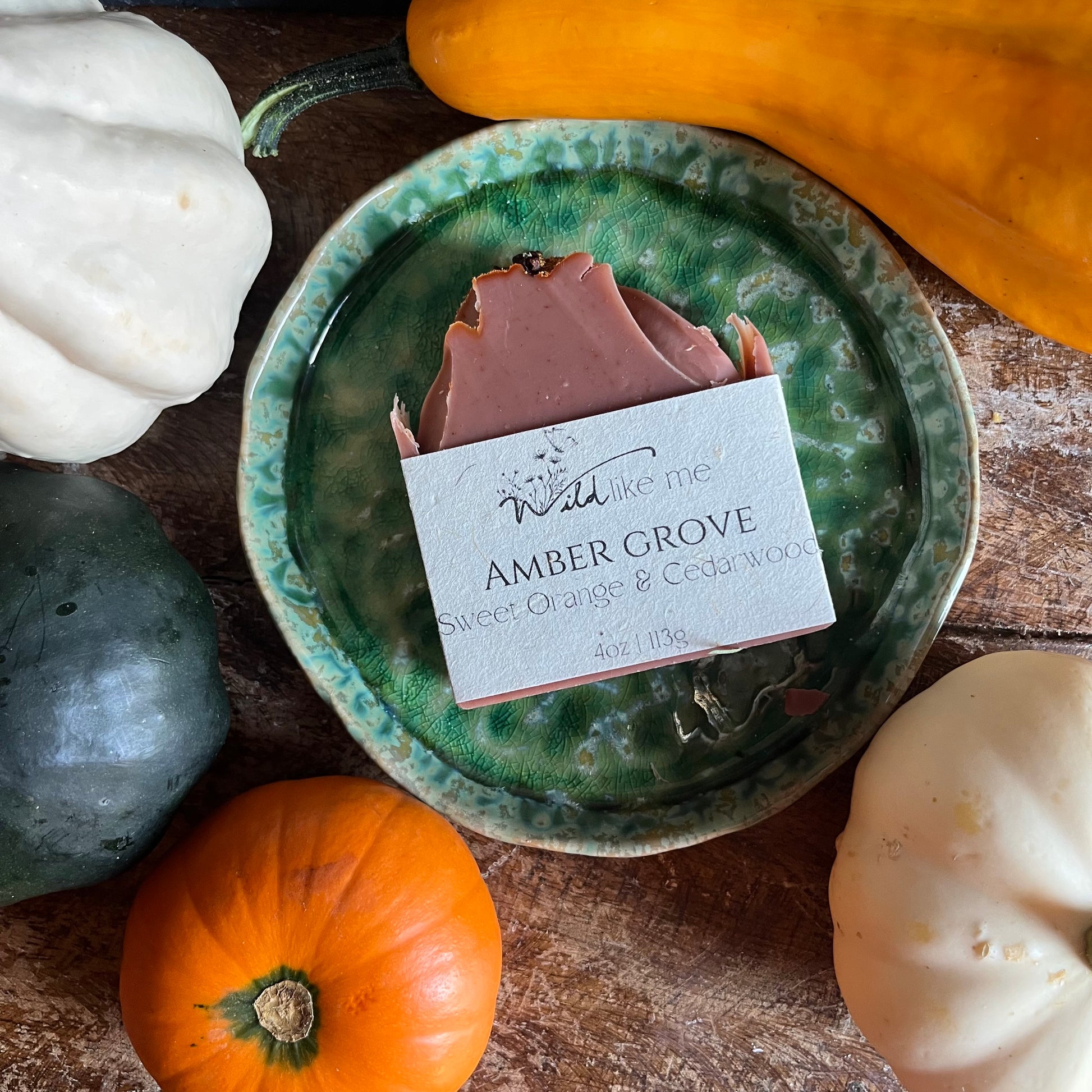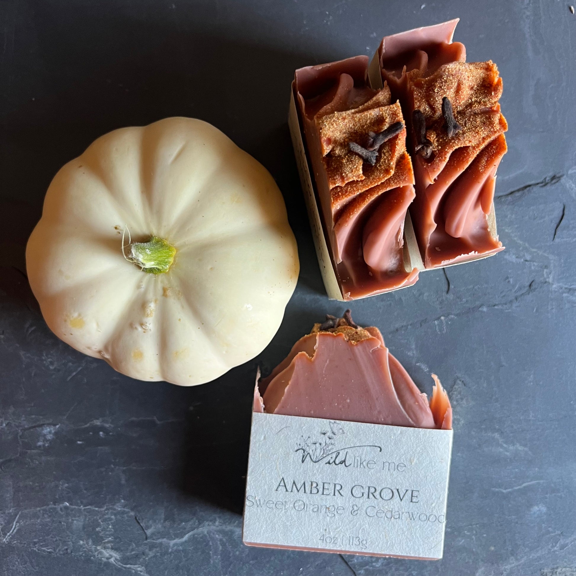 Amber Grove is a harvest-inspired bar that captures the glow of crisp fall days. Colored naturally with Brazilian yellow clay and Moroccan red clay, it shines in rich amber-orange hues. The scent is a grounding blend of sweet orange, cedarwood, and patchouli—bright citrus softened by warm woods and earthy depth. Finished with a light sifting of paprika and whole cloves nestled in the peak, it’s as inviting to the eyes as it is to the senses. Cleanse with warmth. Root yourself in the season.