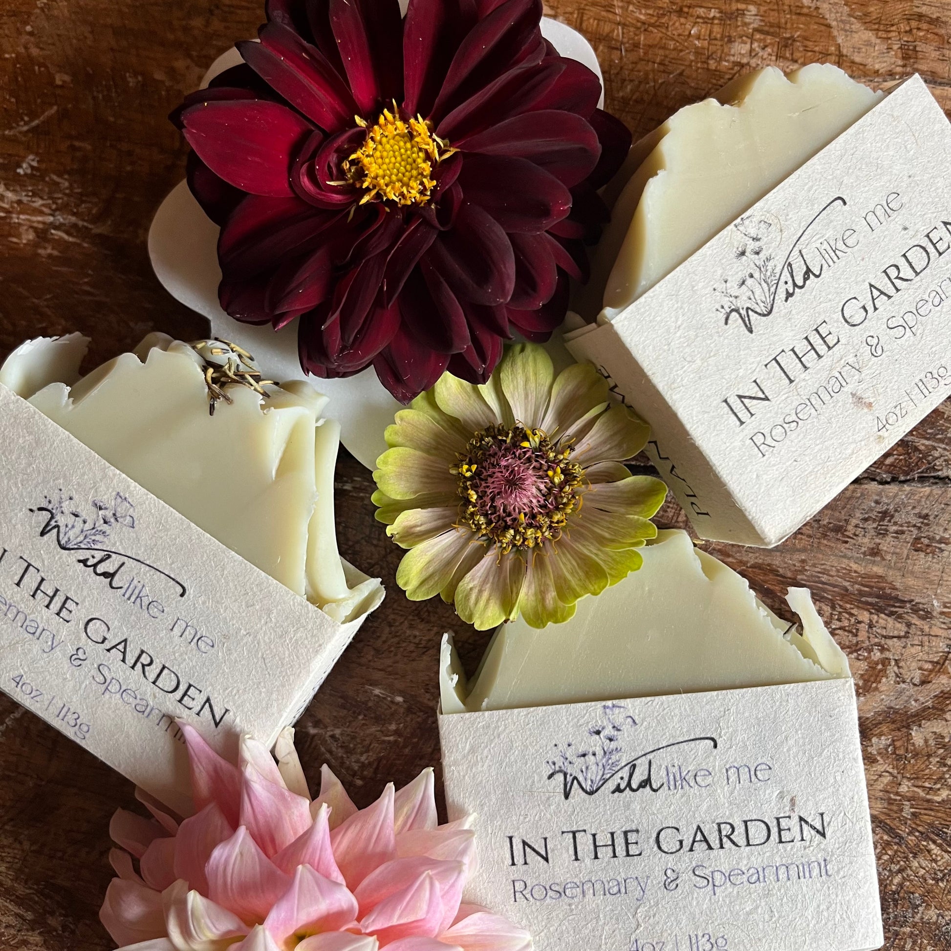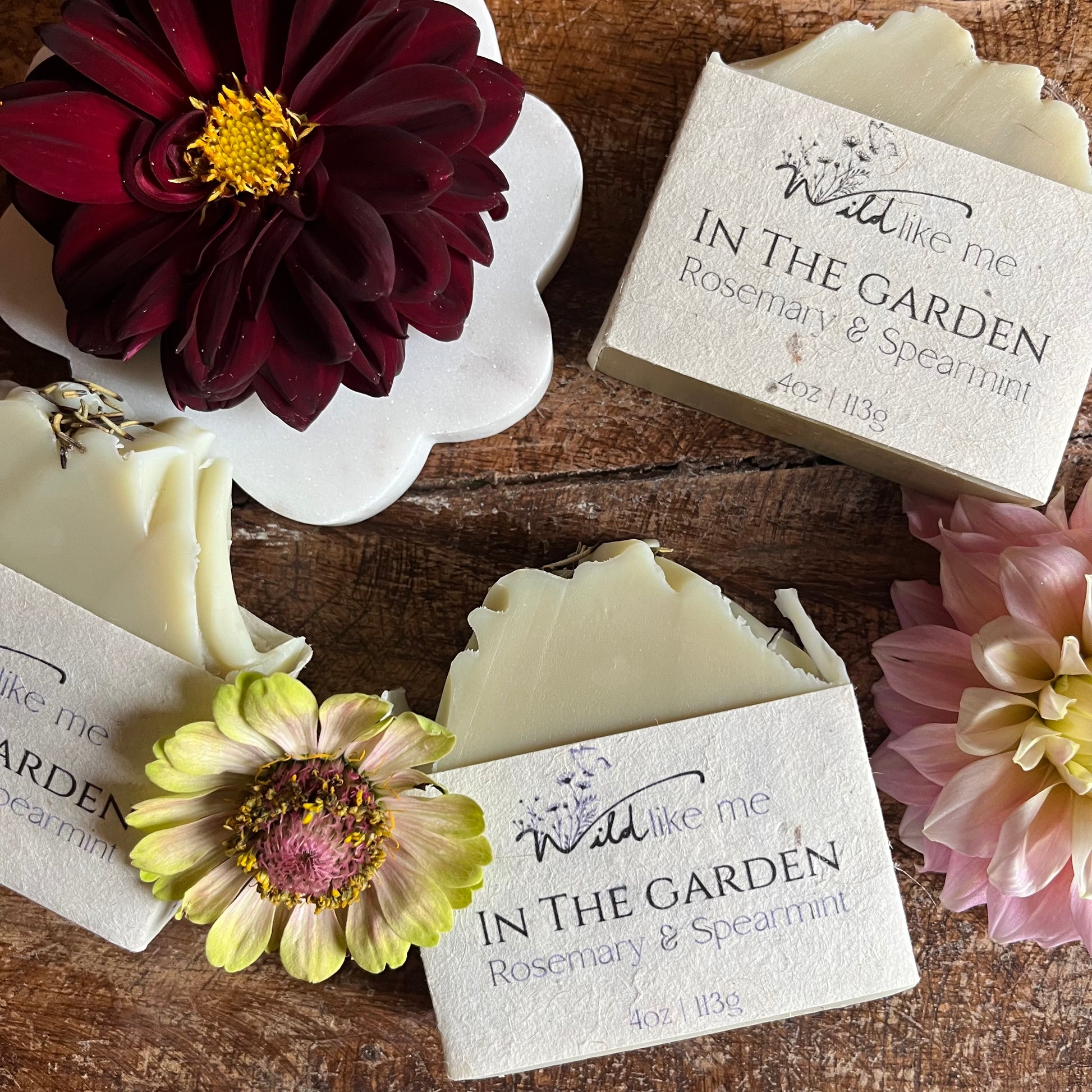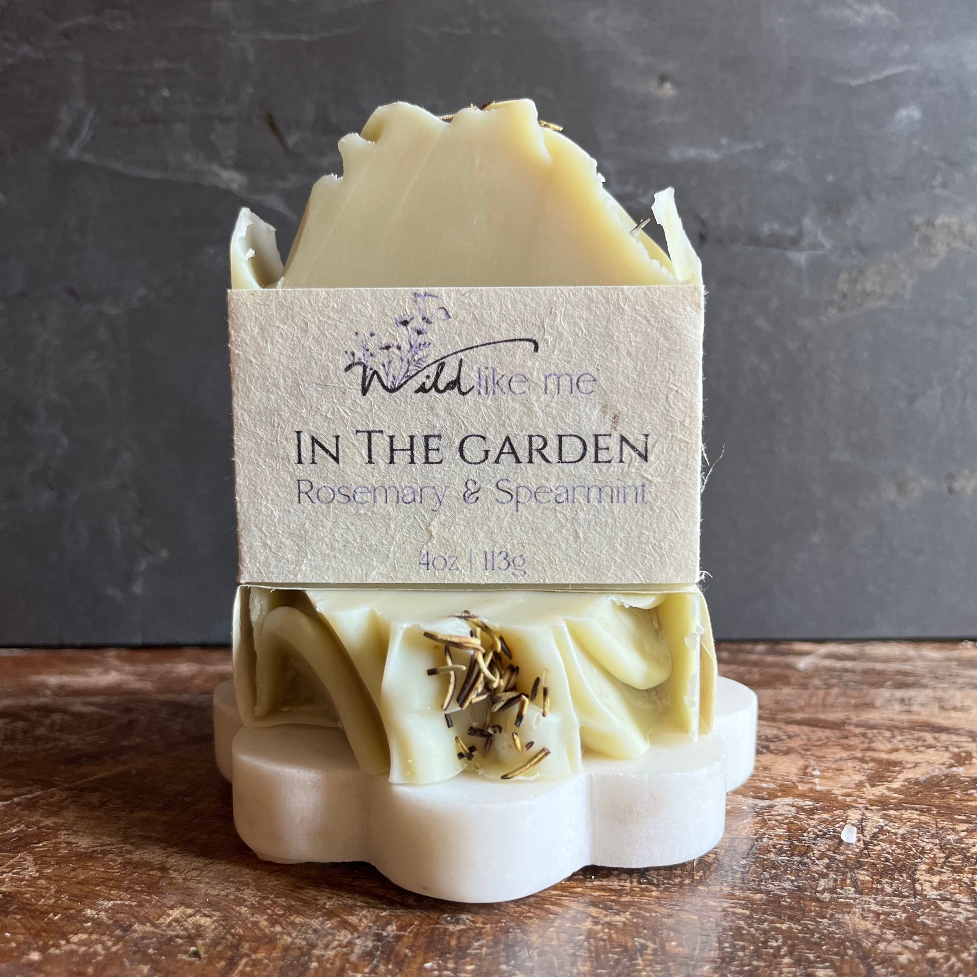 In the Garden is a refreshing bar rooted in the quiet magic of herbs. Scented with rosemary and spearmint essential oils, it’s crisp, green, and clean—like brushing past tall herbs in a summer garden. French green clay and kaolin clay offer a soft green hue and creamy lather, while the tallow and raw milk base nourishes deeply with every use.