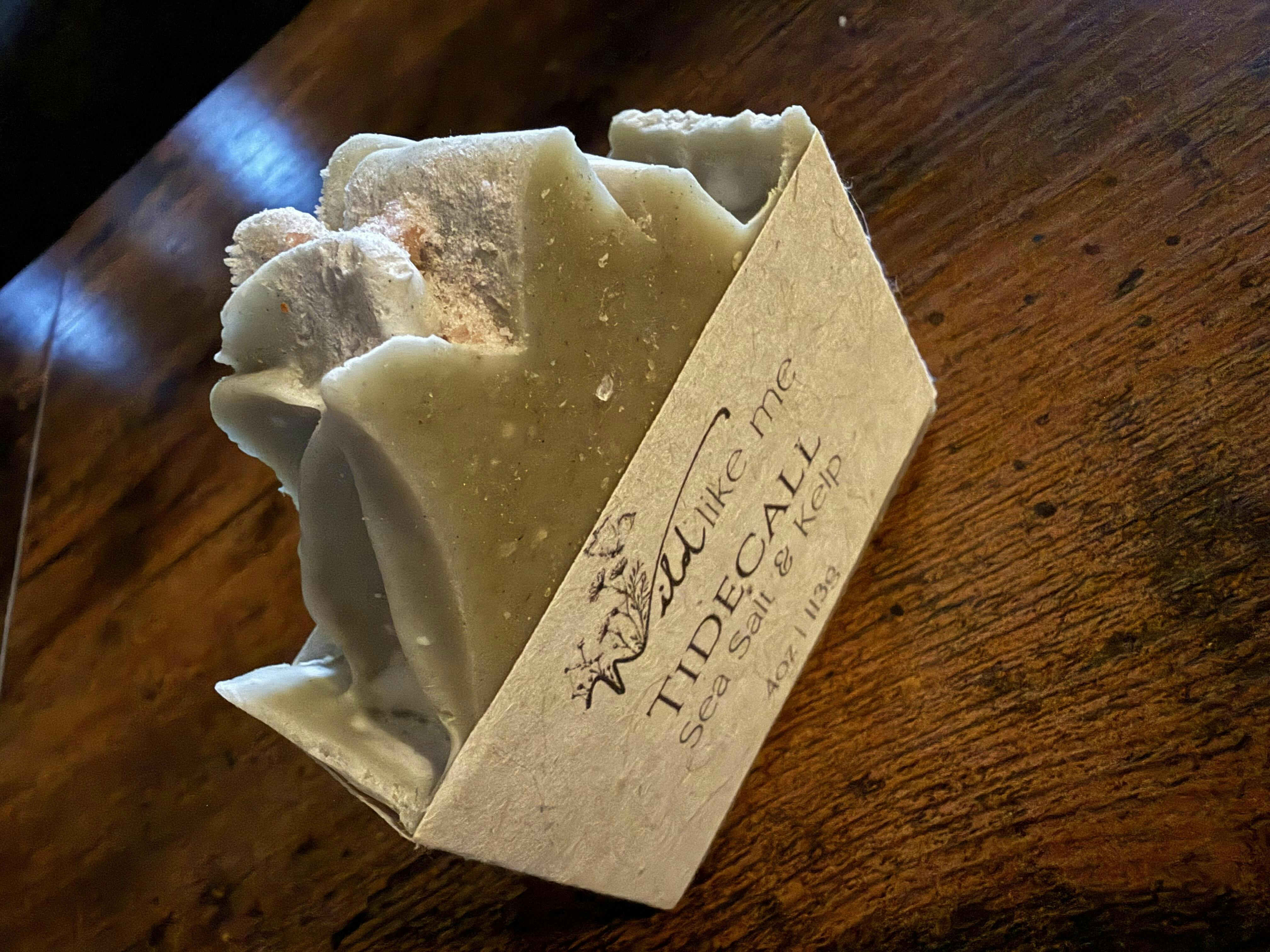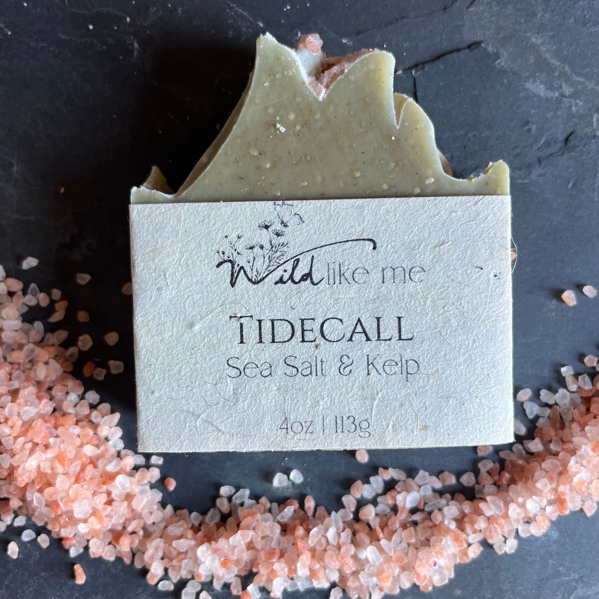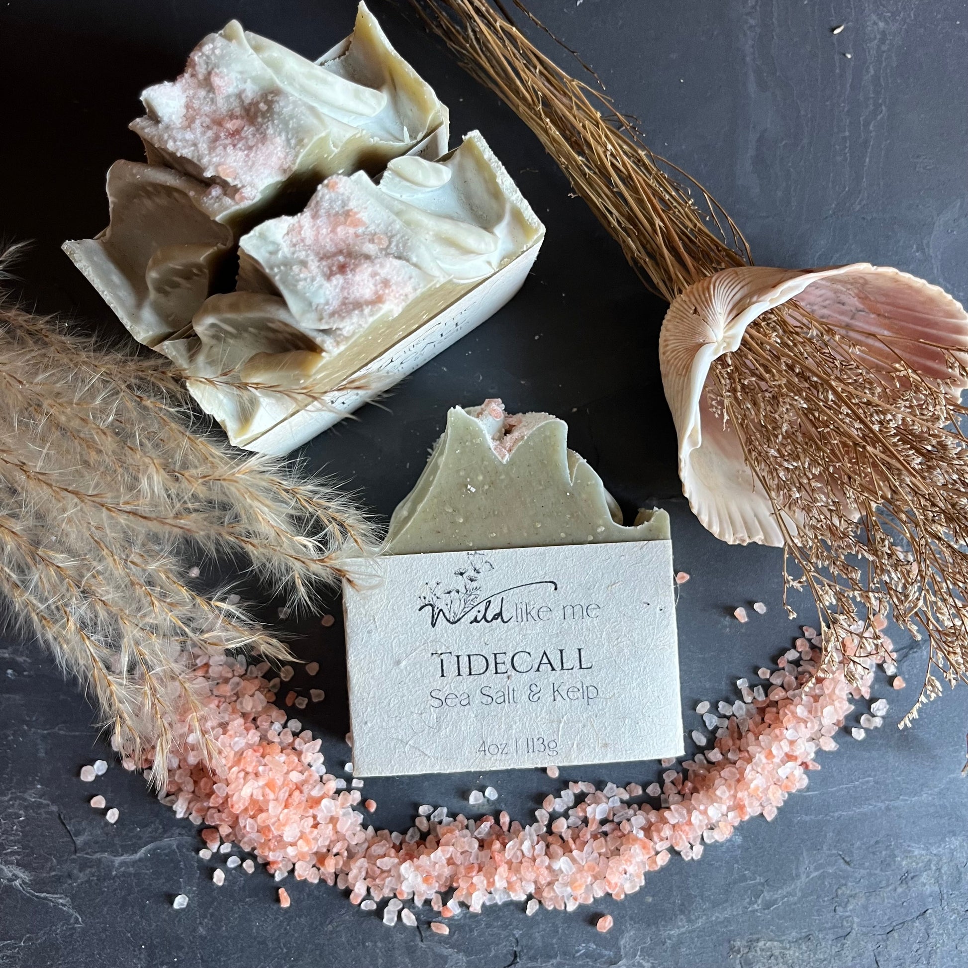 Tidecall is a salt-kissed bar infused with mineral-rich Icelandic kelp, French green clay, and fine sea salt to purify and restore. Colored naturally with indigo and clay, it mirrors the cool, deep hues of the ocean. The scent is a refreshing blend of peppermint, eucalyptus, lavender, and cedarwood—like a breath of coastal forest air. Cleanse with clarity. Emerge renewed.