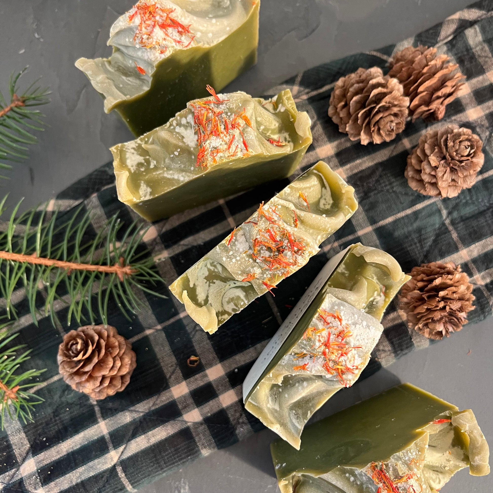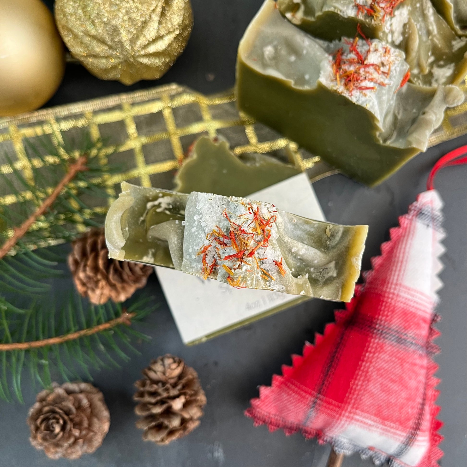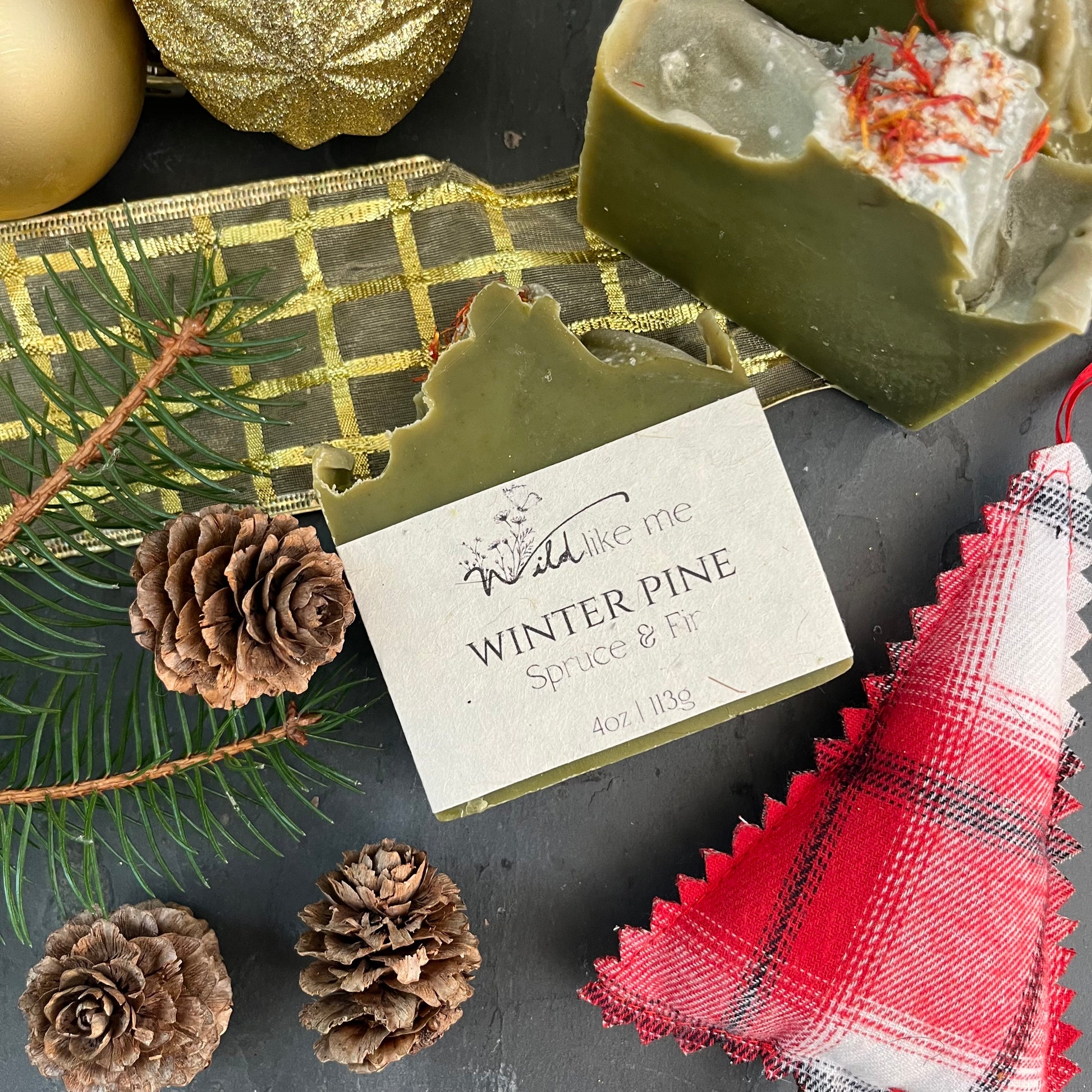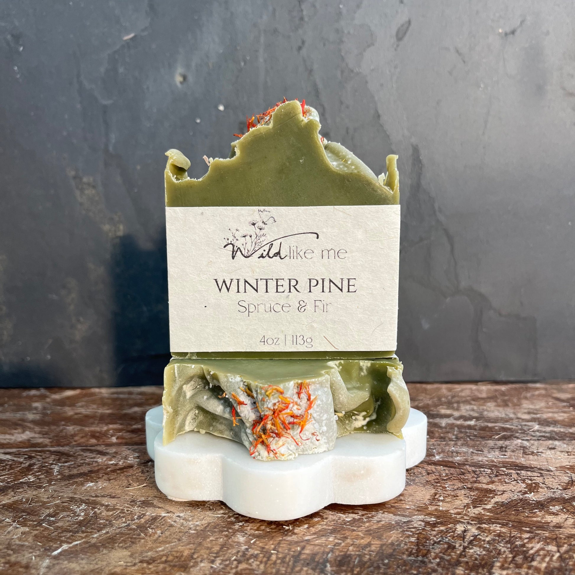 Winter Pine captures the ritual of winter’s stillness—walking through snow-dusted pines, crisp air filling your lungs, and resin clinging to your hands. Scented with a forested blend led by fir needle and layered with spruce, juniper berry, a whisper of spearmint, and grounding patchouli, this bar embodies the peace of a quiet evergreen grove beneath a winter sky. Spirulina and French green clay lend the soap its deep pine hue and a softly cleansing lather that reflects the calm clarity of the season.